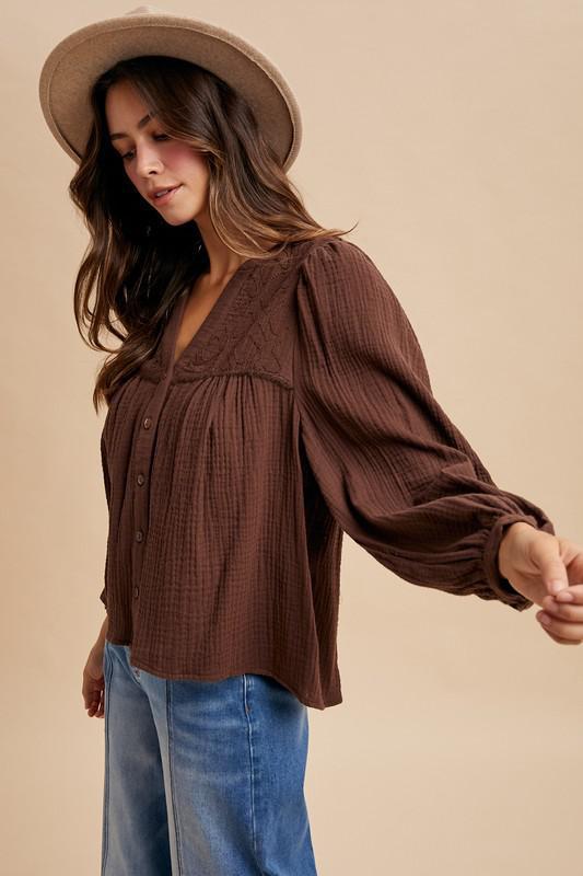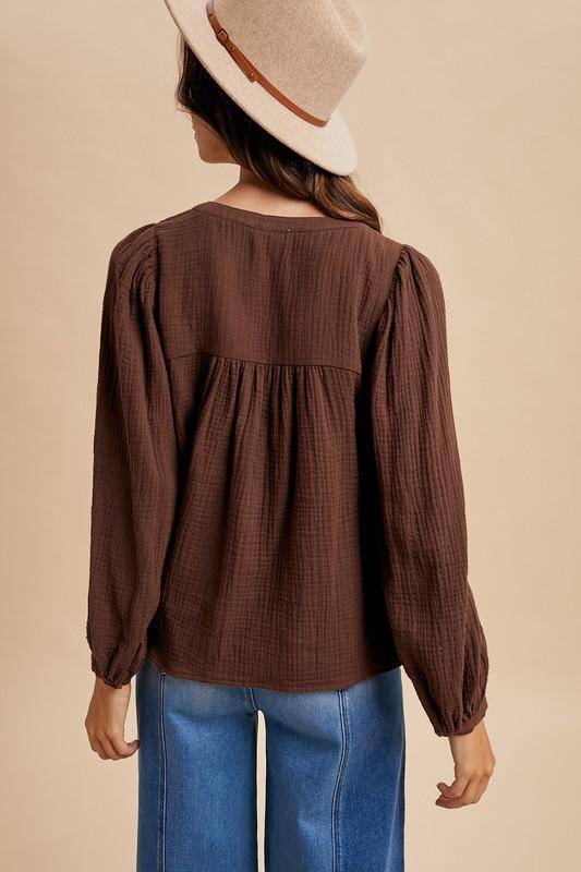 Soft, breezy, and beautifully detailed—this cotton gauze blouse features intricate cord embroidery along the yoke, a notched neckline, and a relaxed babydoll silhouette. Long puff sleeves and a partial button-down front complete the effortlessly feminine look.