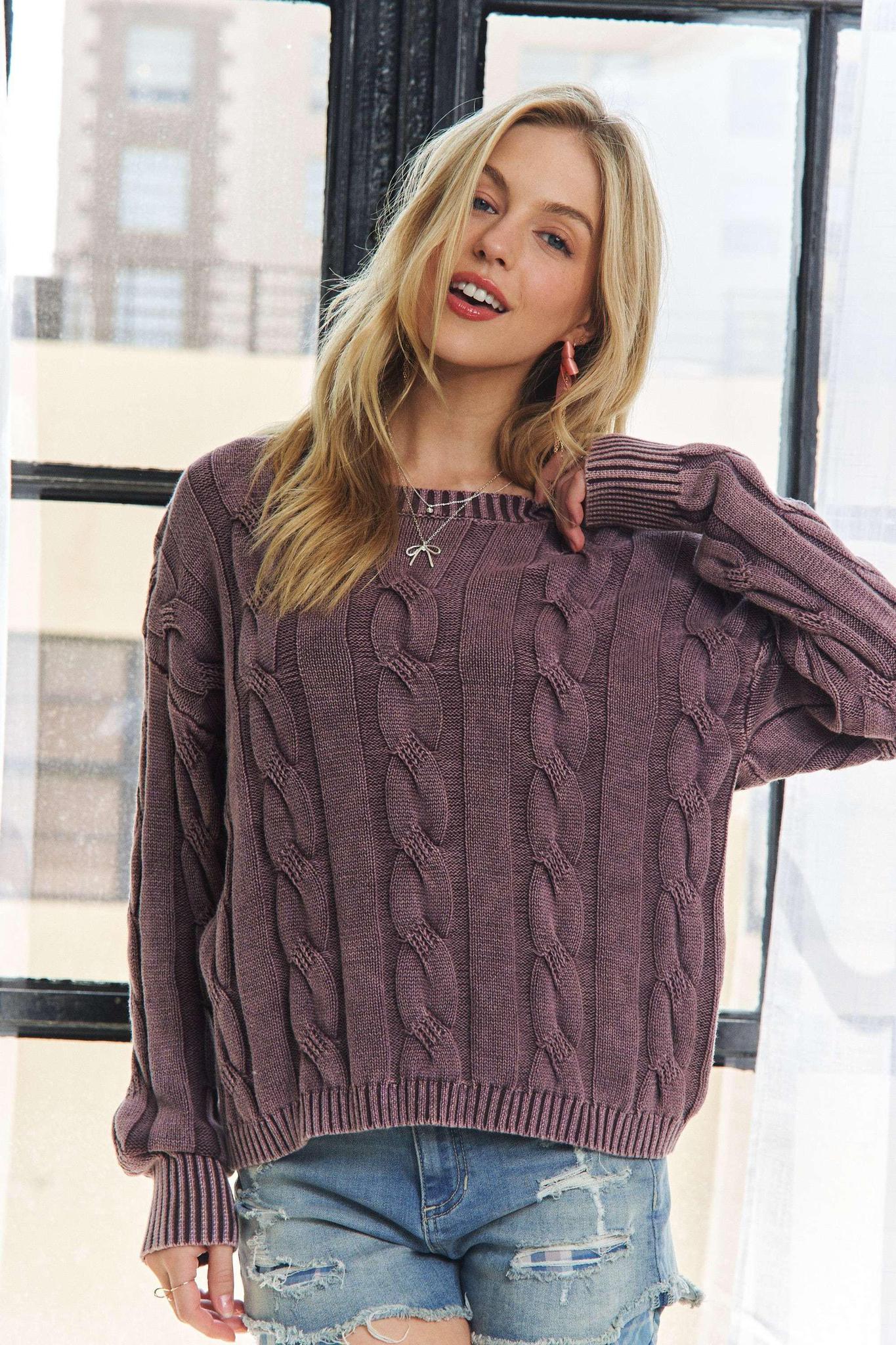 Cozy, chic, and effortlessly stylish, this sweater top brings timeless texture to your wardrobe. The mineral-washed finish gives it a soft, lived-in look, while the classic cable knit pattern adds depth and dimension. Designed with a relaxed fit and comfortable ribbed cuffs and hem, it’s perfect for layering over jeans, skirts, or leggings. Whether you’re dressing up for a casual outing or keeping it cozy at home, this sweater top combines comfort and fashion with ease.