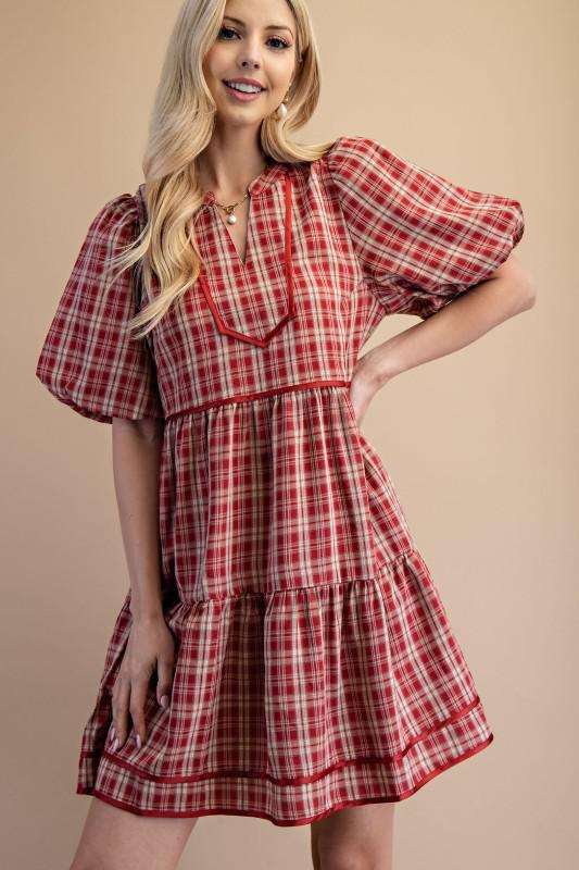 Plaid Tiered Puff Sleeve Mini Dress