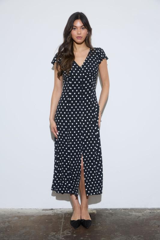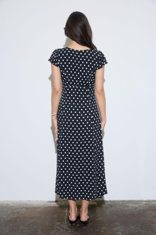 Step into timeless elegance with this Polka Dot Button Down Midi Dress. Featuring a flattering V-neckline, playful short ruffle sleeves, and functional button-down front, this dress effortlessly combines classic charm with modern style. The lightweight fabric blend of viscose and rayon offers a soft, breathable feel, while the fully lined midi silhouette ensures comfort and coverage.